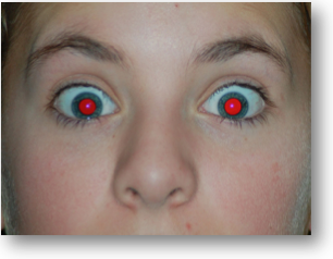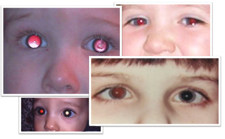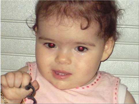 Kırmızı göz bebekleri bize önemli bilgiler vermektedir. Bu küçük çocuğa,loş bir odada, 1m mesafeden ışık tutarak bu kırmızı göz bebeklerini görebiliriz.
