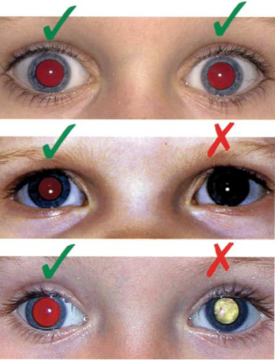 Kırmızı göz bebekleri aynı renk ve parlaklıkta ve eşit büyüklükte görülmelidir. Farklı olduklarında ise, katarakt (göz merceğinin saydamlığını kaybetmesi), şaşılık, iki göz arasında gözlük numaralarında farklılık, gözün içinde iltihaplanma, gözün içinde kanama, retinoblastom gibi bazı tümörler vb, araştırılması gerekir.